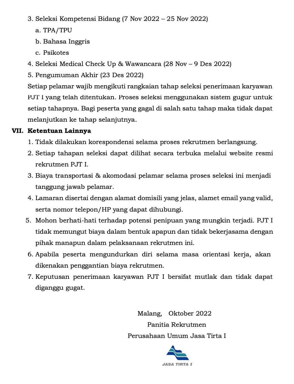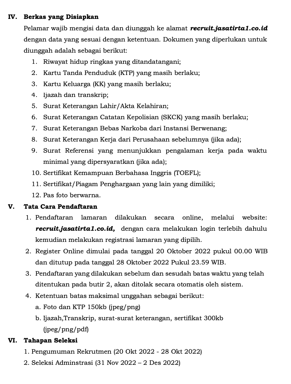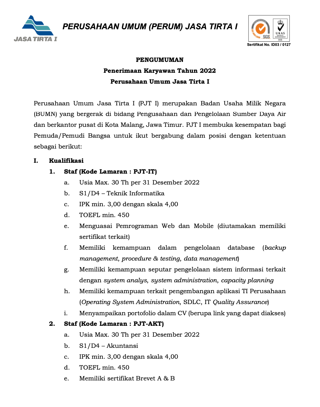 Berikut ini adalah informasi lowongan kerja dari PT Perum Jasa Tirta I, baca dengan baik posisi dan kualifikasi serta tata cara pendaftarannya.