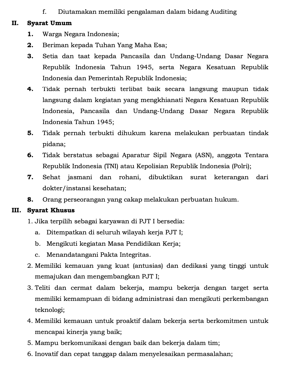 - Ditempatkan di seluruh wilayah kerja PJT I;