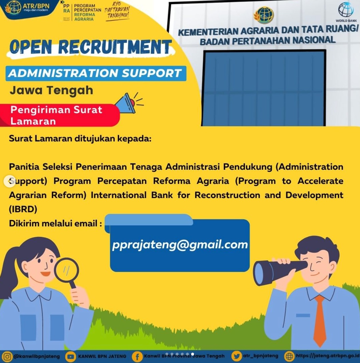 - Panitia Seleksi Penerimaan Tenaga Administrasi Pendukung (Administration Support) Program Percepatan Reforma Agraria (Program to Accelerate Agrarian Reform) International Bank for Reconstruction and Development (IBRD)
