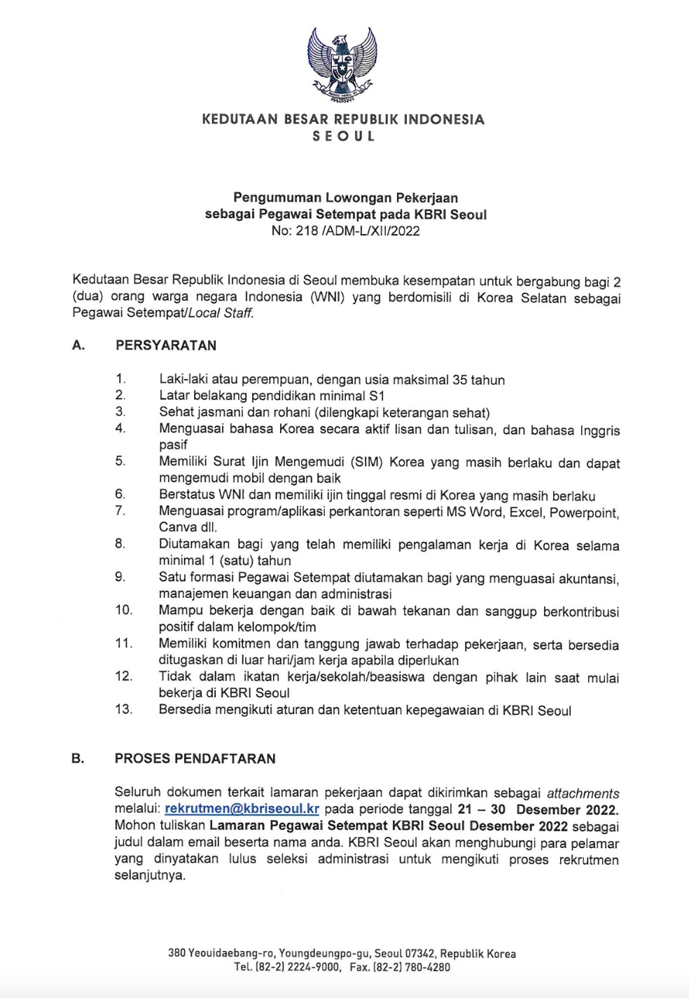 Berikut ini informasi lowongan kerja Kedutaan Besar Republik Indonesia Seoul
