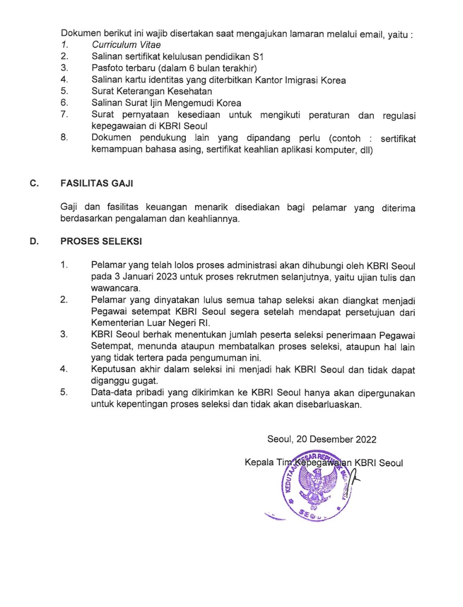 - Pelamar yang dinyatakan lulus semua tahap seleksi akan diangkat menjadi Pegawai setempat KBRI Seoul segera setelah mendapat persetujuan dari Kementerian Luar Negeri RI.