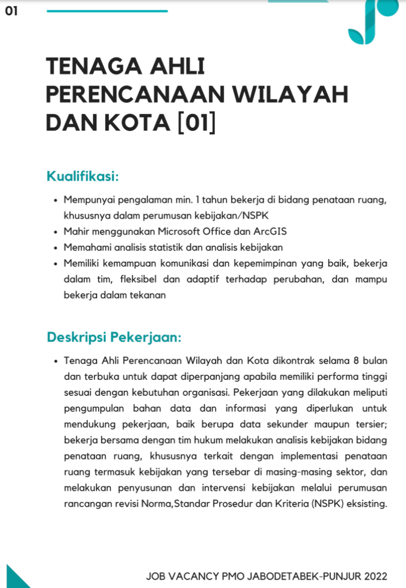 Kali ini gokerja.id sedang ada informasi lowongan kerja dari Perencana Kawasan Perkotaan “PMO Jabodetabek-punjur“. PMO Jabodetabek-punjur bekerja dibawah Menteri Agraria dan Tata Ruang/Badan Pertanahan Nasional selaku Ketua Tim Koordinasi PMO Jabodetabek-punjur untuk merealisasikan rencana tata ruang Kawasan Perkotaan Jabodetabek-punjur melalui sinkronisasi program, inovasi, dan debottlenecking terkhusus pada 6 isu perkotaan: Banjir, Ketersedian Air Bersih, Sampah dan Sanitasi, Penataan Kawasan Pesisir, Transportasi, dan Pemindahan Ibu Kota.