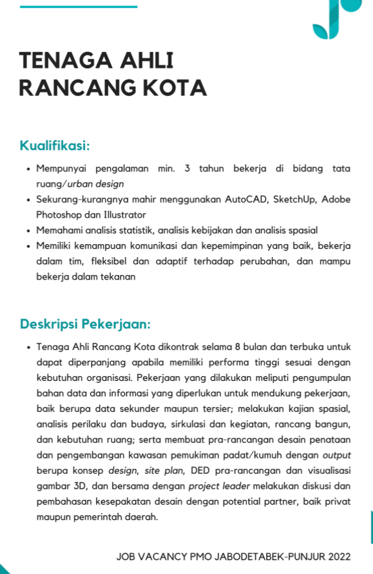 - Mempunyai pengalaman minimal 3 tahun bekerja di bidang tata ruang/urban design