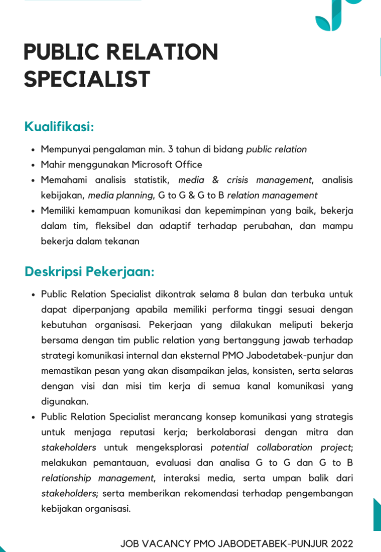 - Mempunyai pengalaman minimal 3 tahun di bidang Public Realtion