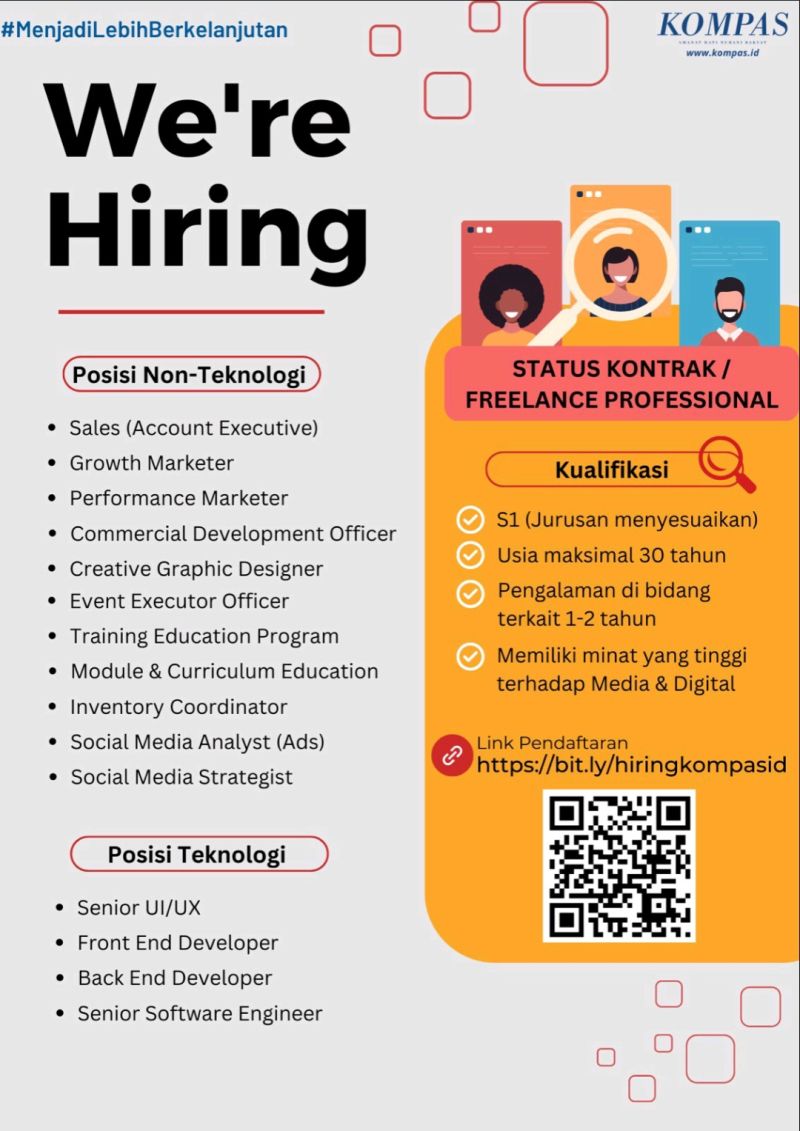 Informasi lowongan kerja hari ini datang dari salah satu perusahaan media. PT Kompas Media Nusantara merupakan perusahaan media yang menerbitkan harian Kompas dan Kompas.id. PT Kompas Media Nusantara yang merupakan bagian dari kelompok usaha Kompas Gramedia (KG).