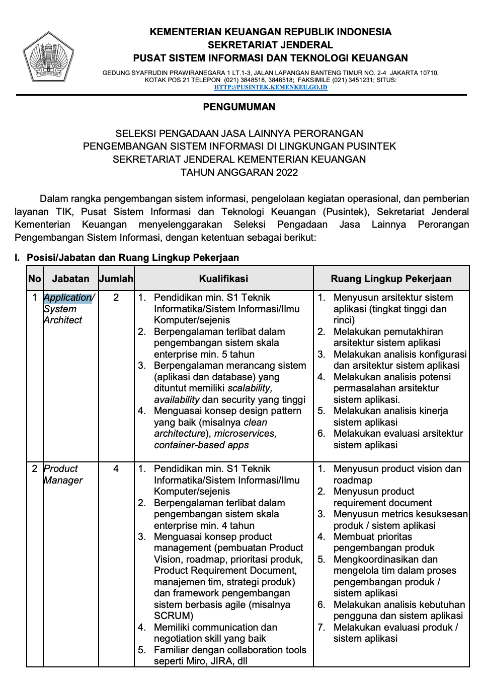 Berikut ini adalah informasi lowongan kerja dari Pusintek Kementerian Keuangan baca dengan baik posisi dan kualifikasi serta tata cara pendaftarannya :