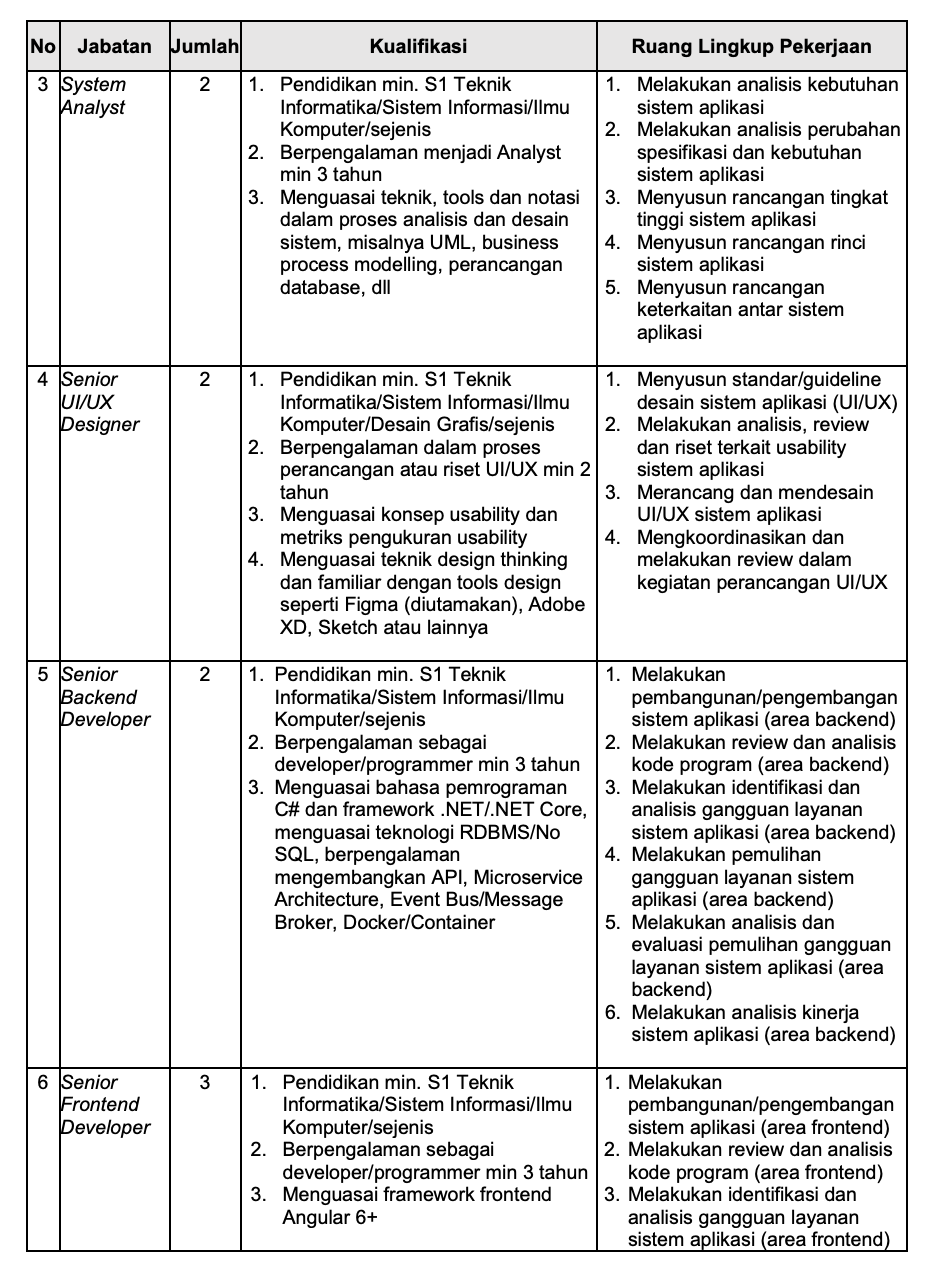 - Berpengalaman terlibat dalam pengembangan sistem skala enterprise minimal 4 tahun