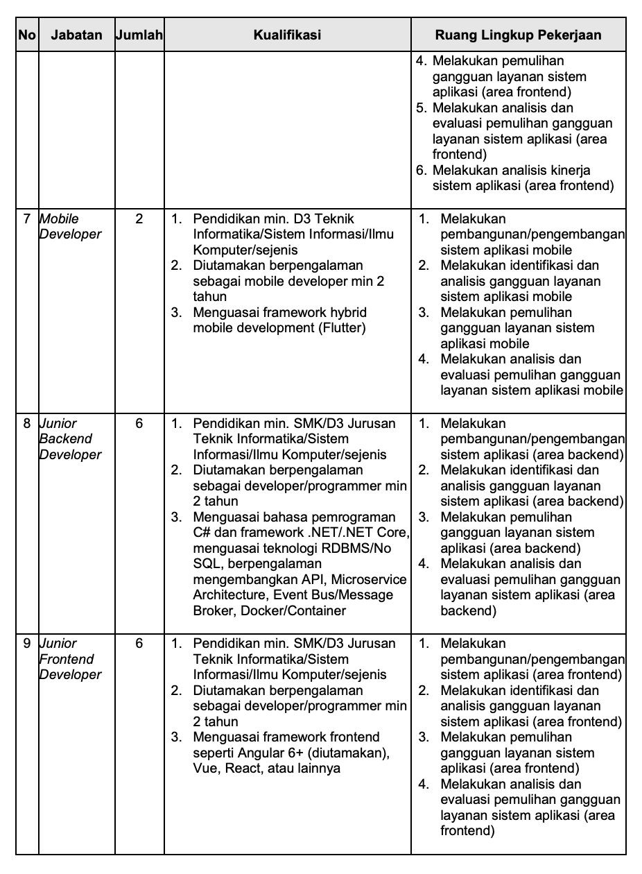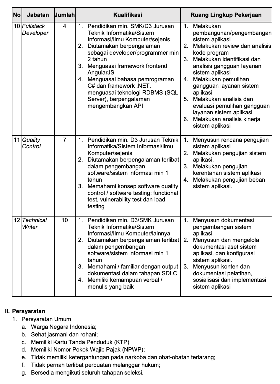 - Diutamakan berpengalaman terlibat dalam pengembangan software/sistem informasi minimal 1 tahun