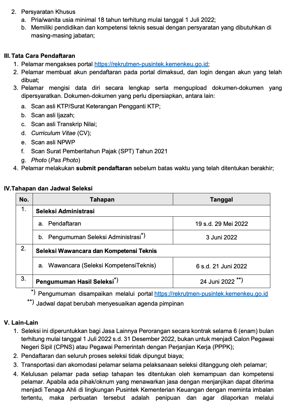 Hati-hati terhadap segala jenis penipuan yang mengatasnamakan Instansi, karena lowongan kerja ini tidak dipungut biaya alias gratis
