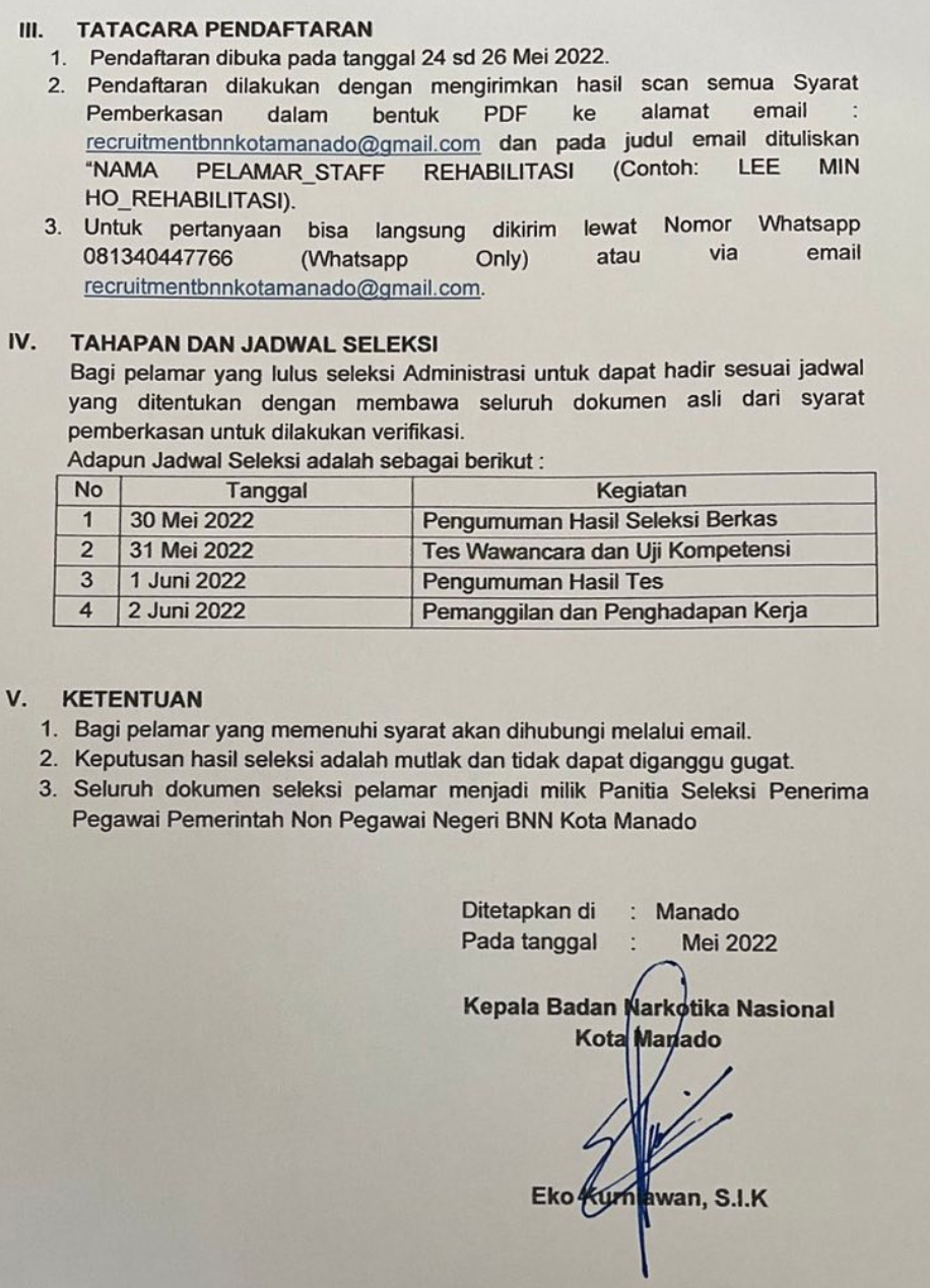 - recruitmentbnnkotamando@gmail.com dengan subject email Nama_STAFF REHABILITASI ( Contoh : LEE MIN HO_REHABILITASI)
