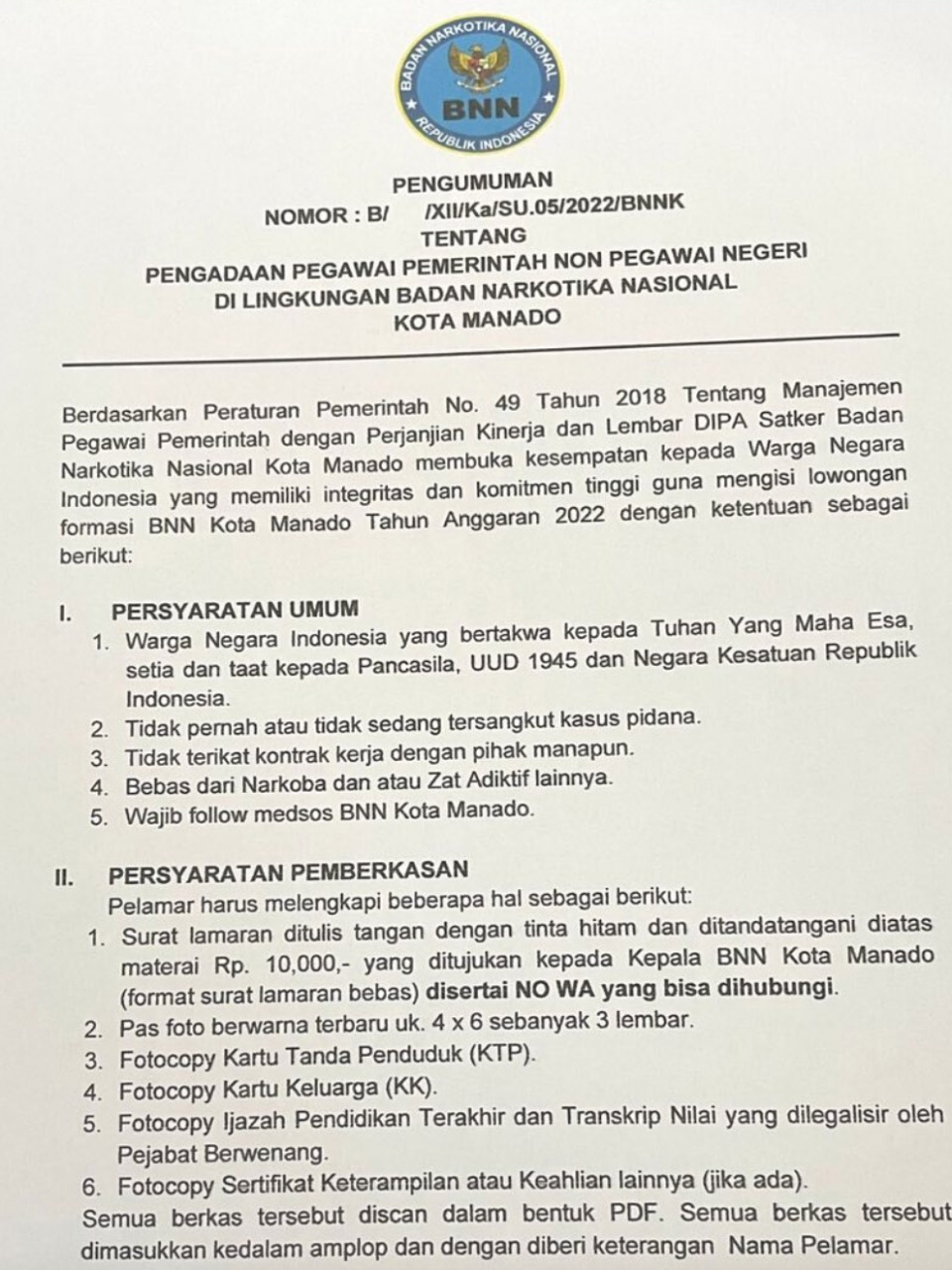 Penerimaan PPNPN Badan Narkotika Nasional Kota Manado