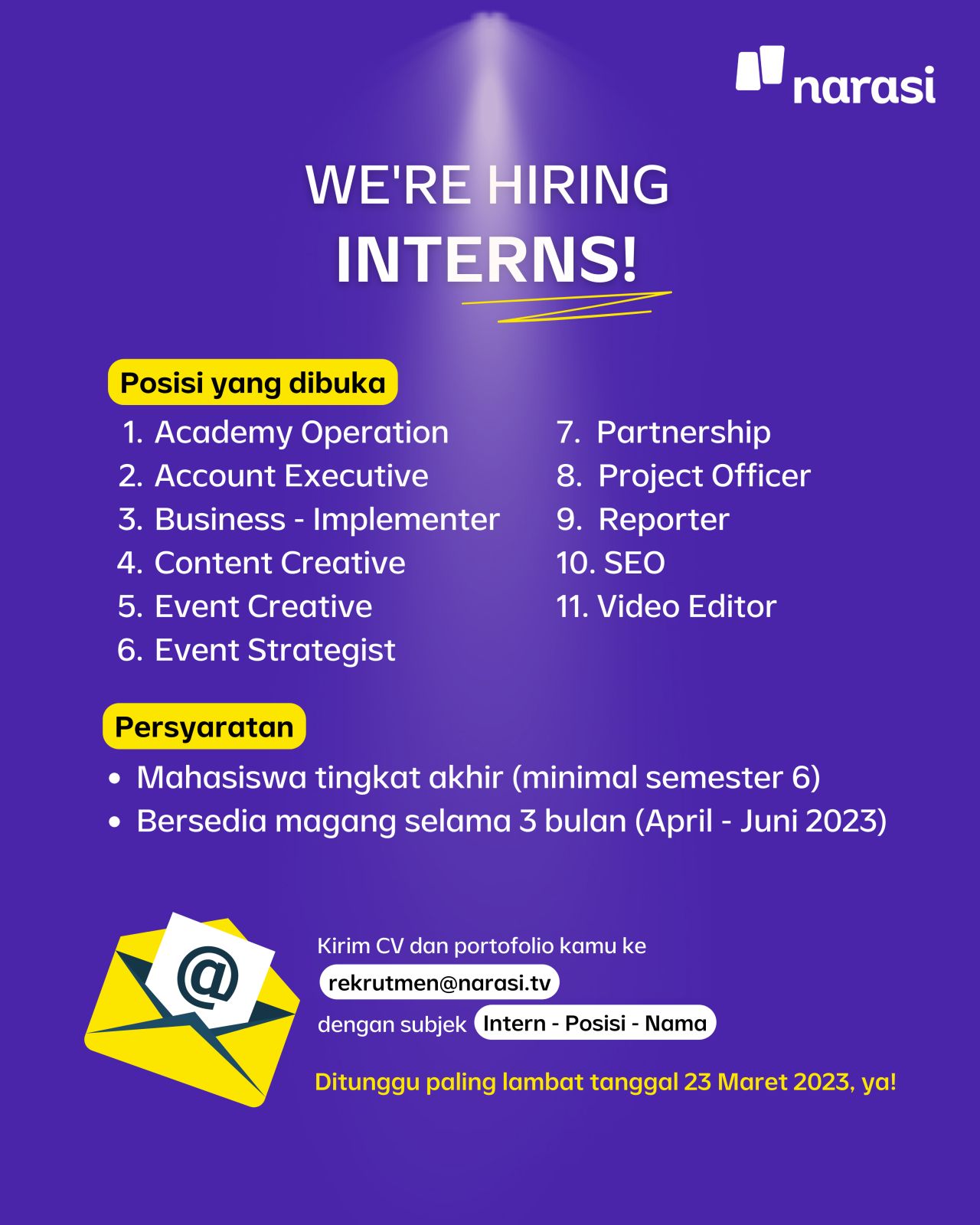 • rekrutmen@narasi.tv dengan subjek: Intern – Posisi – Nama